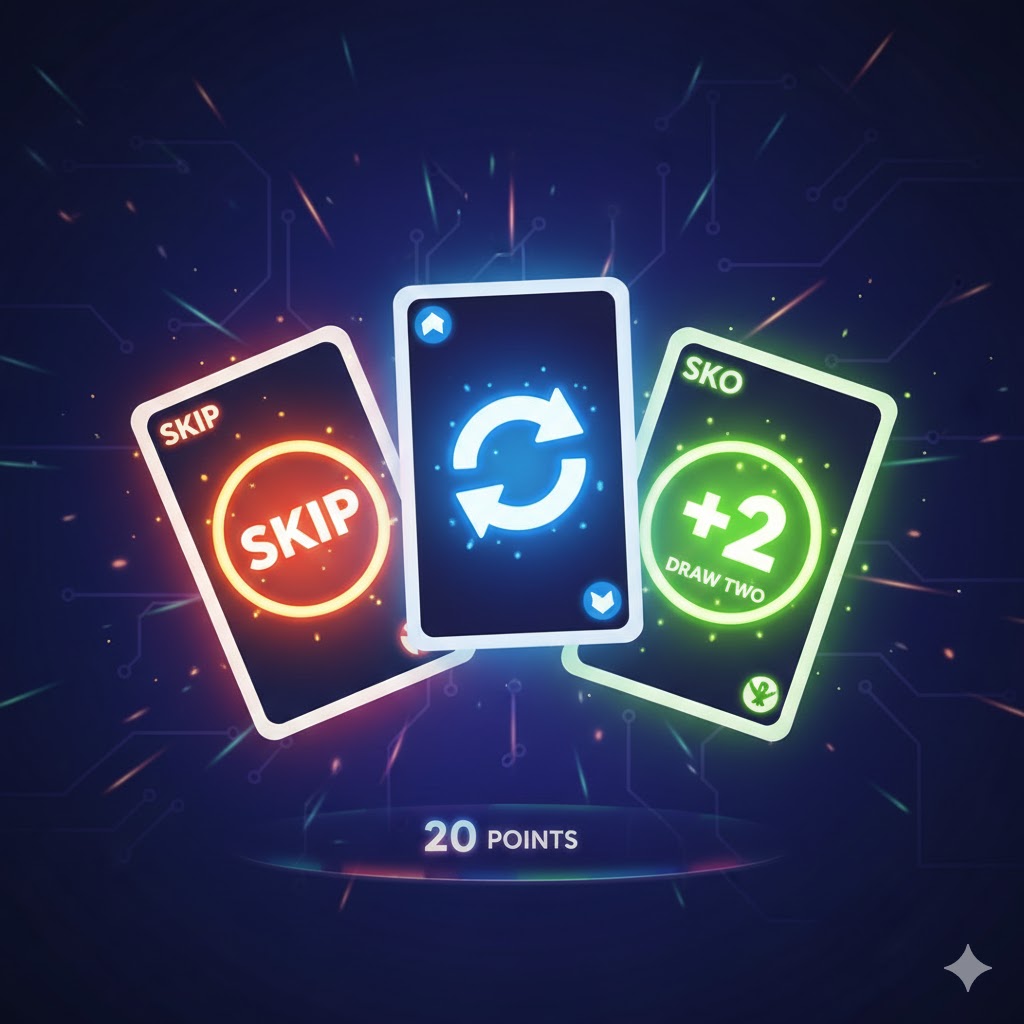 Action cards—specifically Skip, Reverse, and Draw Two—carry a significantly higher weight than standard number cards. Each of these cards is valued at 20 points. The rationale behind this higher value is their utility in the game; since these cards allow players to manipulate the turn order or penalize others, they are considered "premium" assets. From a scoring perspective, being caught with a handful of Action cards can be disastrous. If you hold two Skips and a Draw Two when the round ends, you have just handed the winner 60 points, which is 12% of the way to the 500-point goal.