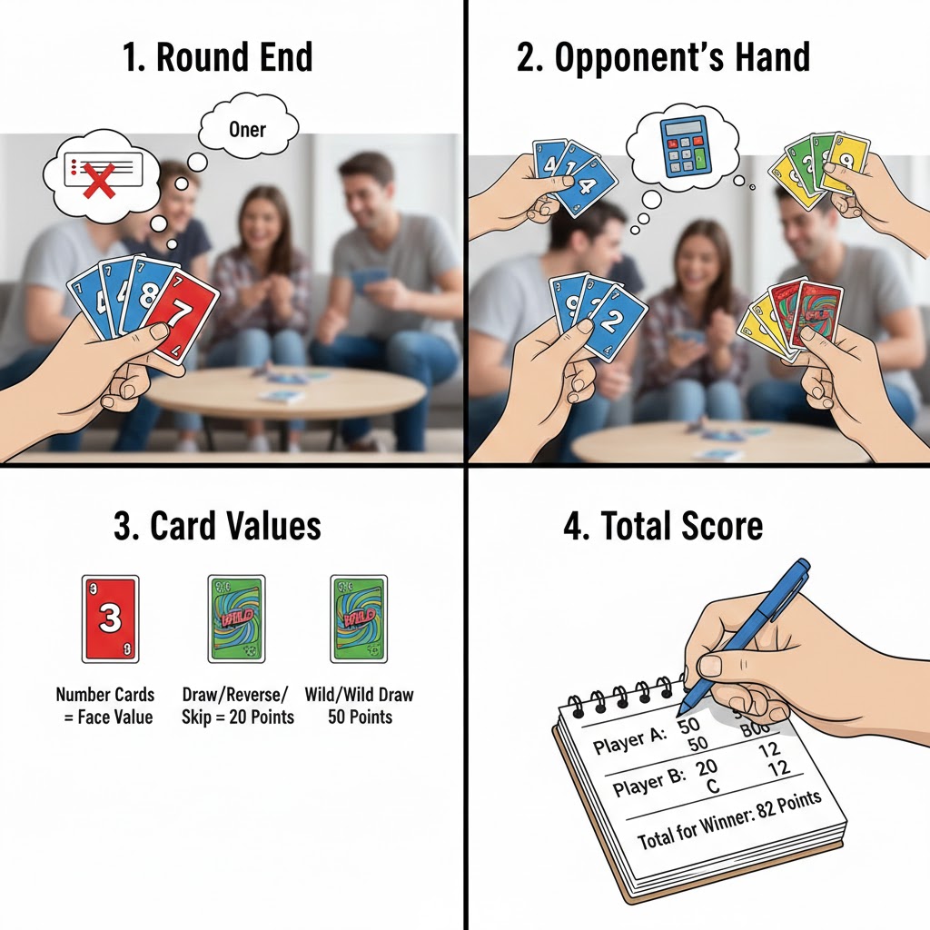 A crucial aspect of how scoring works in UNO involves what happens when the final card played is a penalty card. If the winner plays a Draw Two or a Wild Draw Four as their last card, the next player in the turn order must still draw the required cards before the points are tallied. These newly drawn cards are included in the winner's point total for that round. This rule prevents players from "escaping" the consequences of an opponent's final move and ensures that the scoring reflects the true final state of the board. It is one of the few instances where a player's hand size increases after the winner has already been determined. Read similar articles.