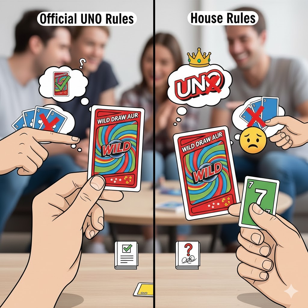 Official UNO has strict penalties for playing the wrong card or failing to say "UNO." If you play an illegal card and are caught, you must take it back and draw two cards. Many house rules are more lenient, allowing players to simply swap the card for a correct one. Similarly, the official "UNO" call penalty is exactly two cards, whereas some house rules demand drawing five or even ten cards as a more severe punishment.