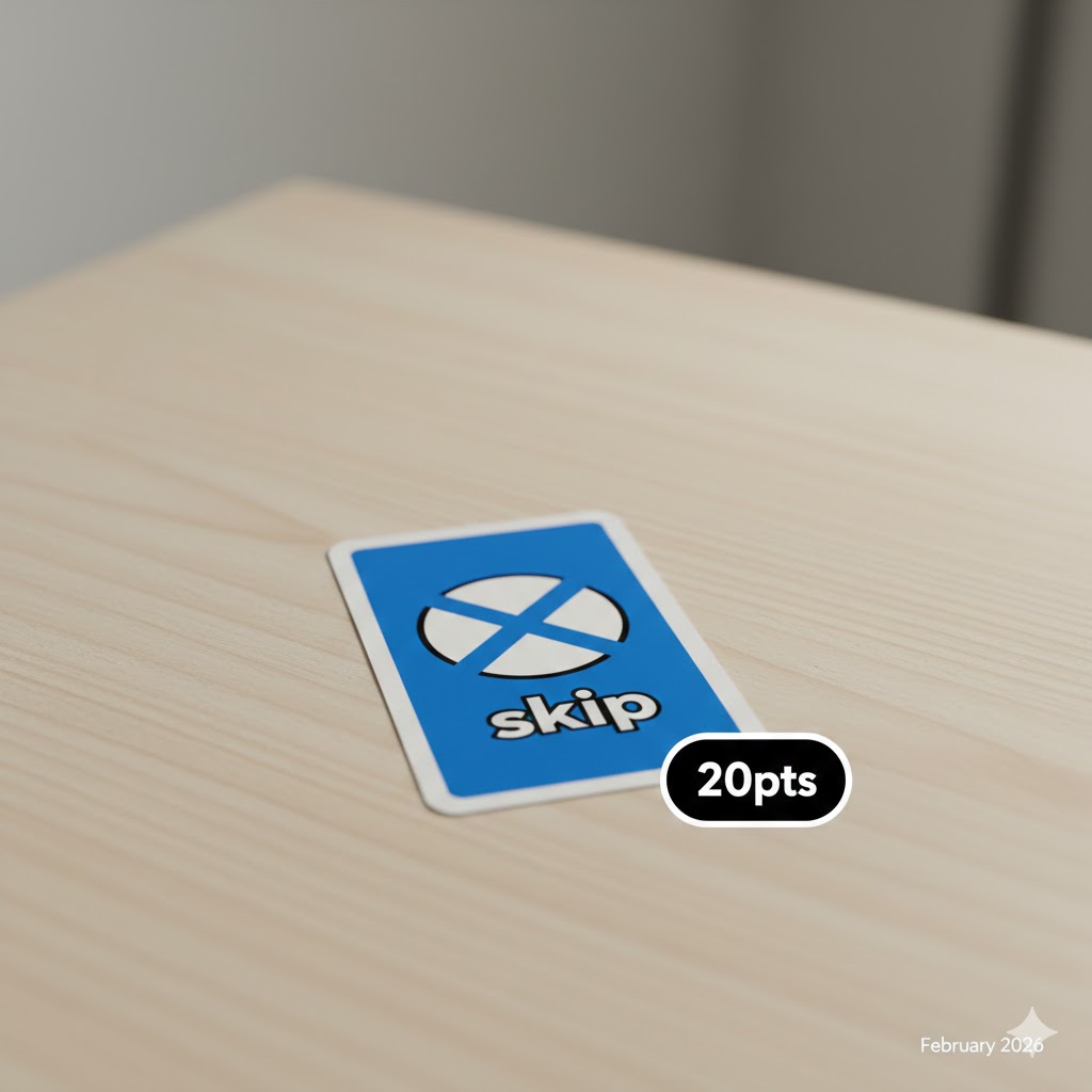 The Skip card is a tactical tool designed to stop the momentum of the next player. In the scoring phase, a Skip card is valued at 20 points. This higher value reflects its ability to control the flow of the game. In New Zealand playstyles, the Skip is often held as a defensive measure to prevent a player with a low card count from finishing. However, holding onto a Skip card for too long is a high-risk strategy. If the round ends abruptly, that 20-point penalty can be a significant setback in a race to 500.